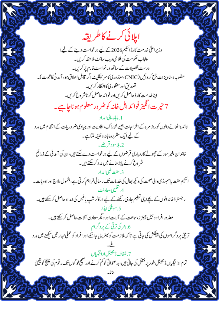 The CM Khidmat Card Scheme 2026 is a powerful step toward social welfare in Punjab. By offering financial aid, healthcare, and opportunities for growth, it helps families improve their quality of life. If you or someone you know qualifies, applying for this scheme can bring real, lasting support.