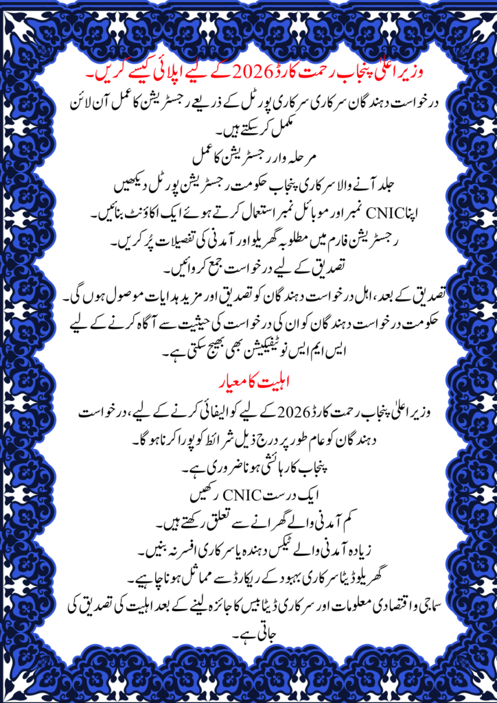 | CM Punjab Rehmat Card 2026 | Financial support for low-income families | Online registration |