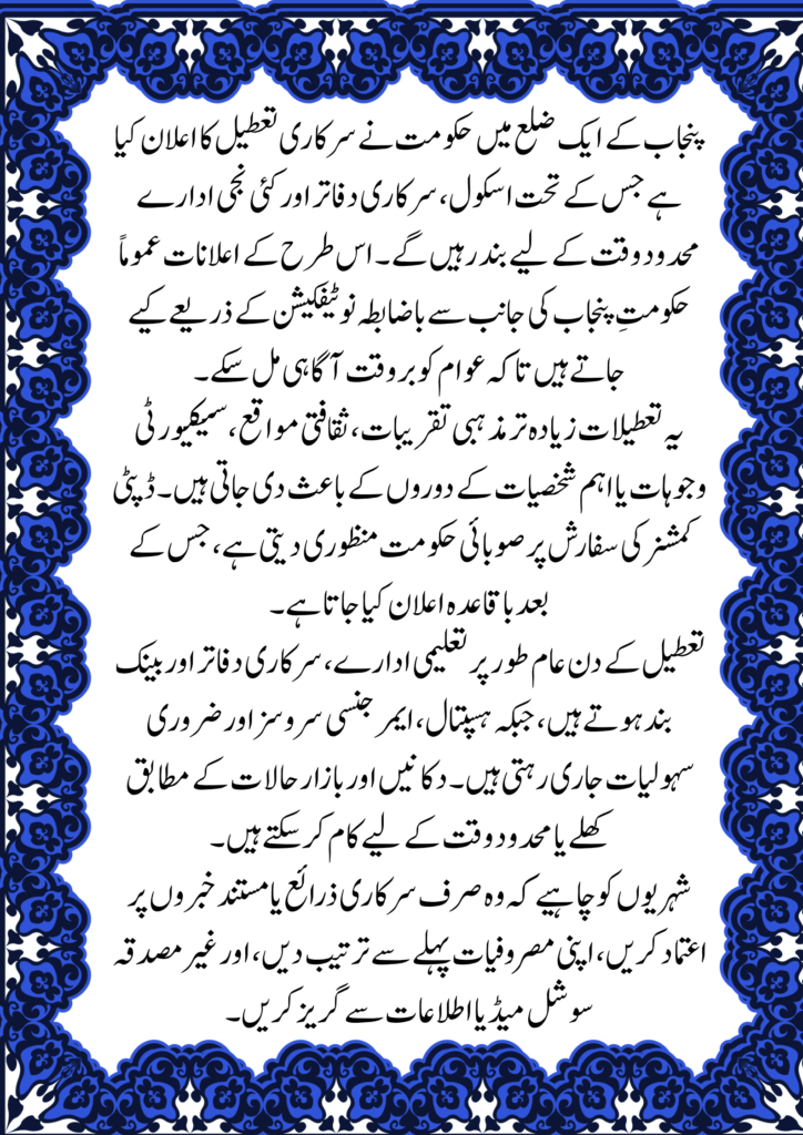 The Government of Punjab usually makes such announcements through official notifications to ensure proper communication and smooth operations across the district.